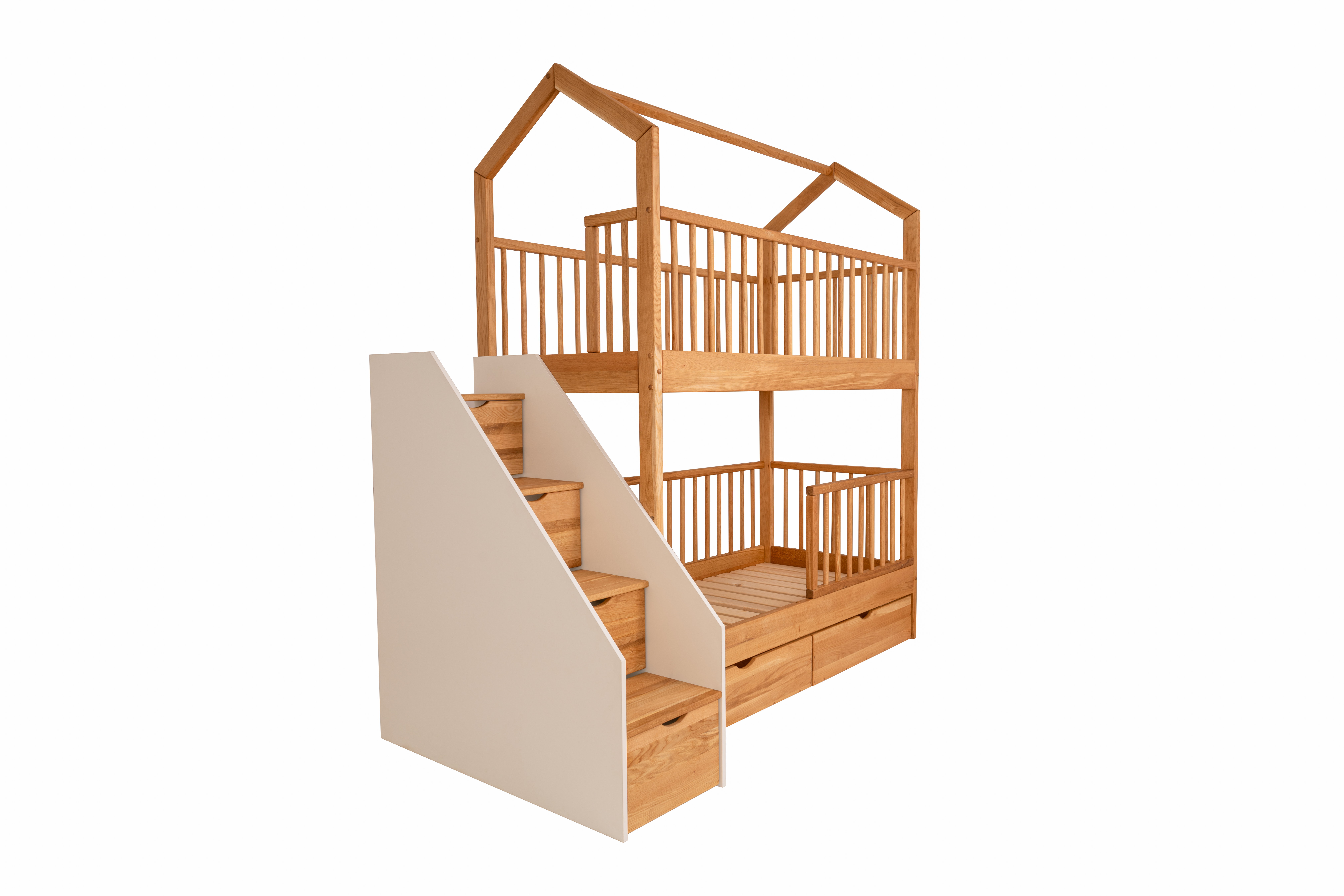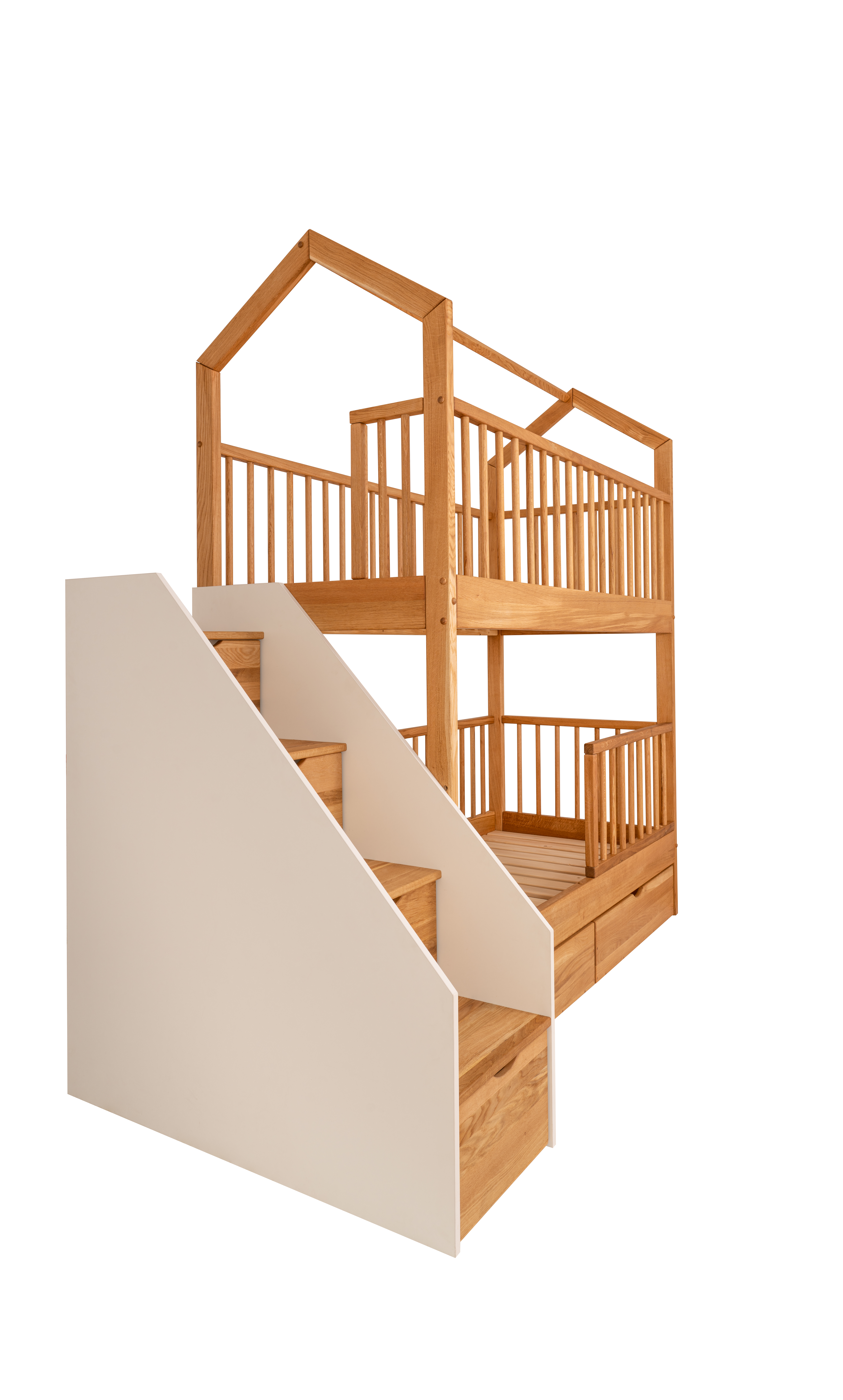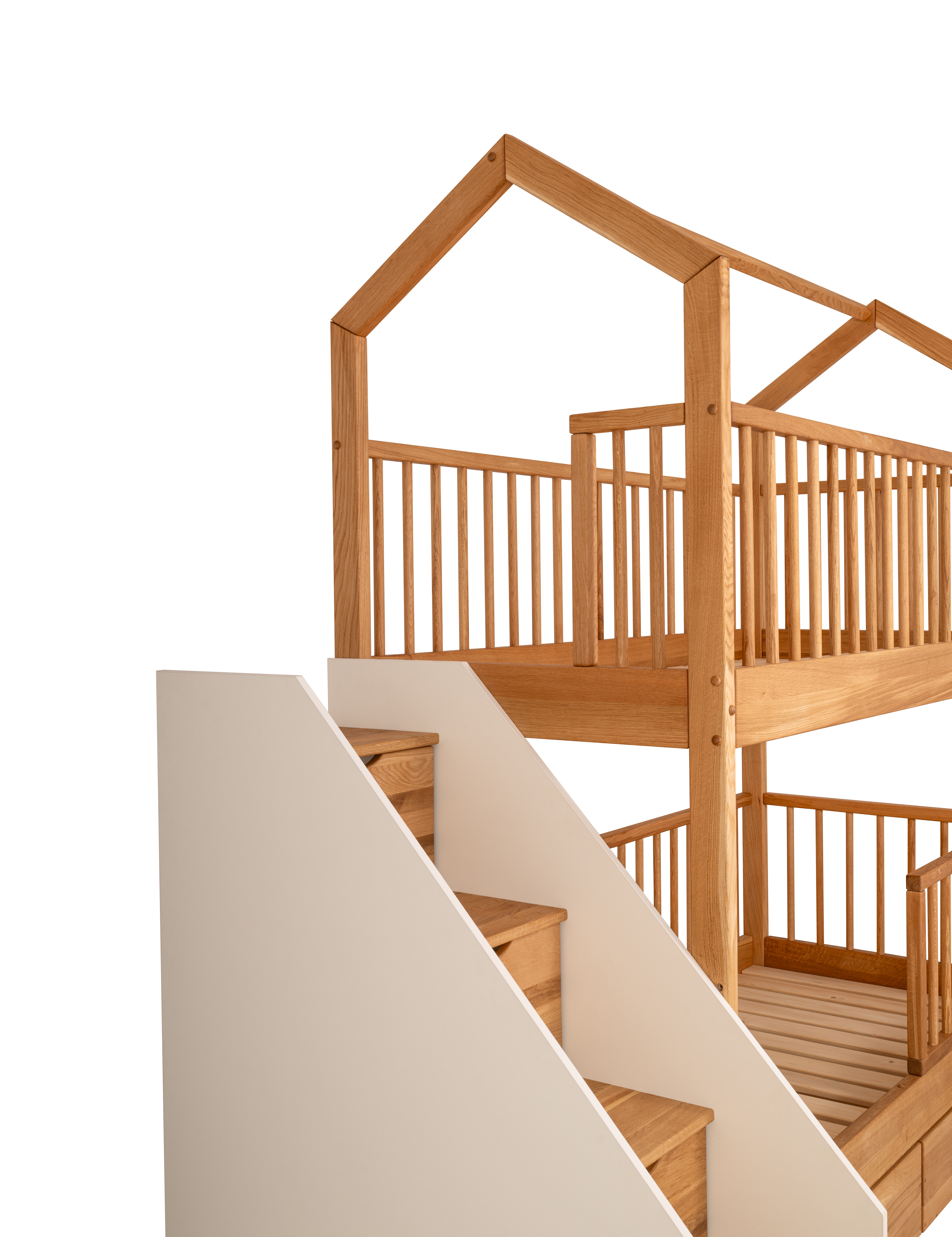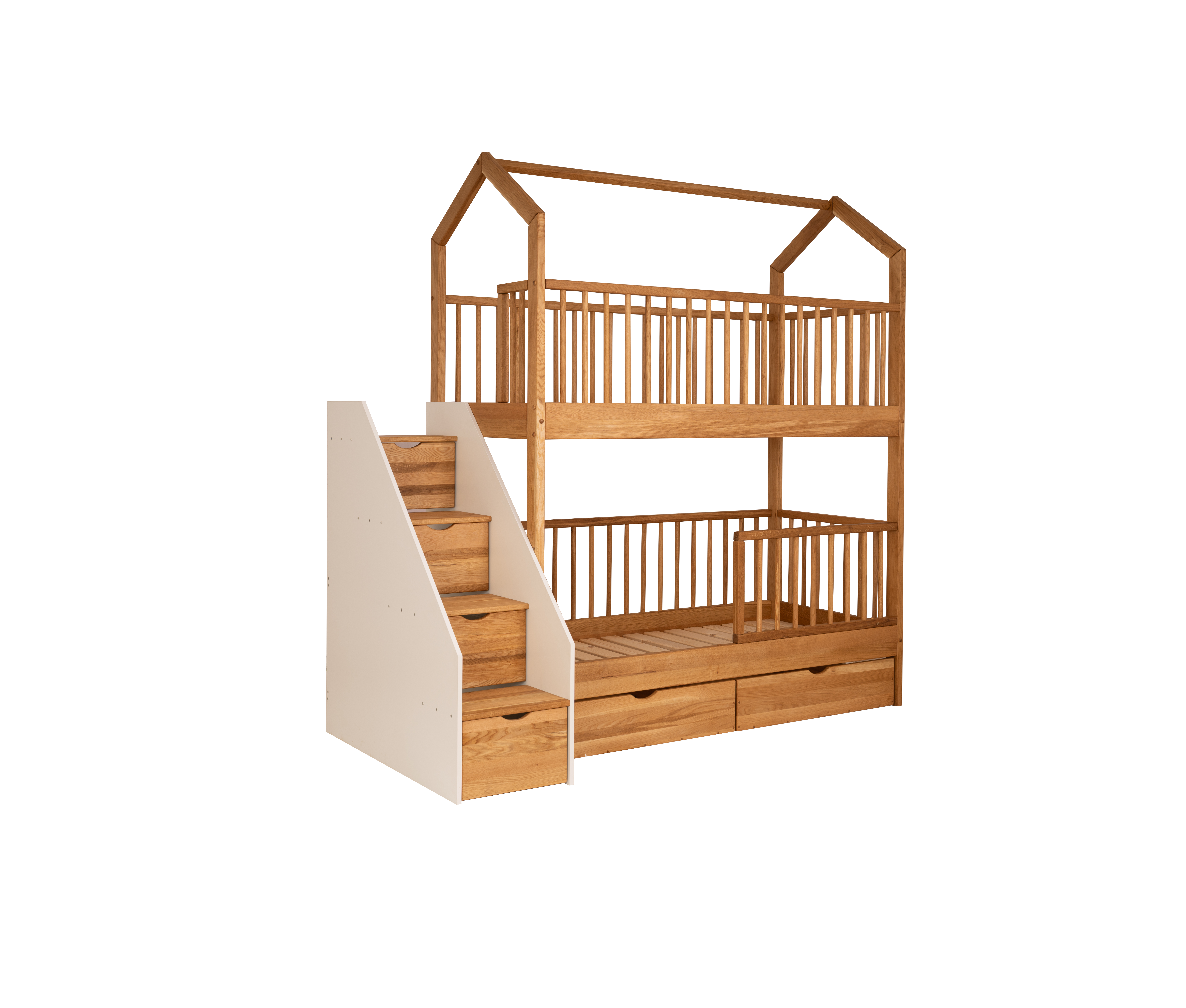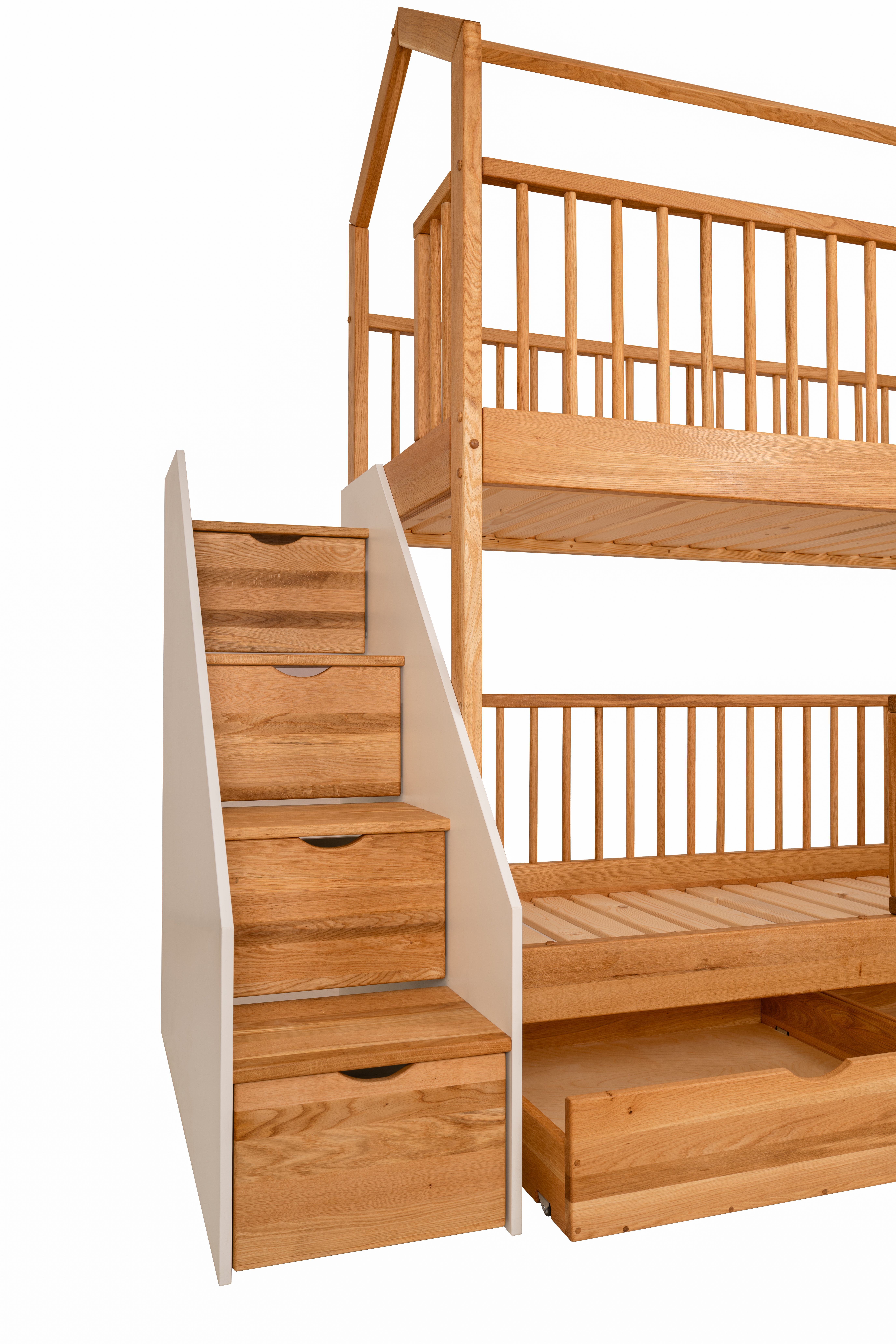 Pograd Hiška Hrast 200×90 je masiven pograd iz slovenskega hrasta z igrivo strešico, ki ustvari prijeten in varen prostor za spanje. Vključuje stopnice s predali, dodatno shranjevanje spodaj ali možnost pomožnega ležišča ter snemljivo ograjico. Ročno izdelan za dolgo življenjsko dobo in maksimalen izkoristek prostora.