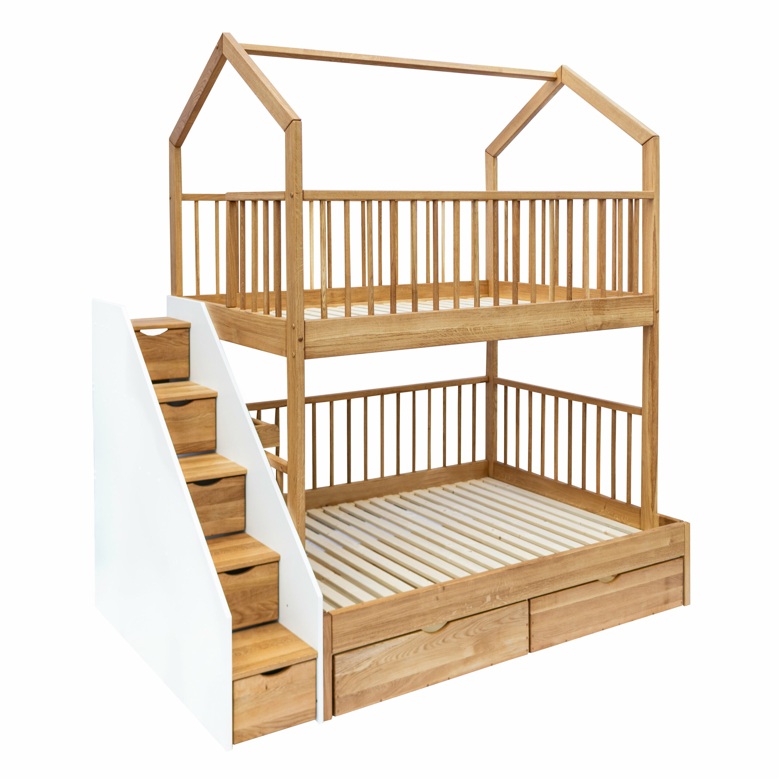 Letto a castello Hiška in rovere sloveno 100%. Letto superiore 200×120 cm, inferiore 200×140 cm. Altezza 265 cm.