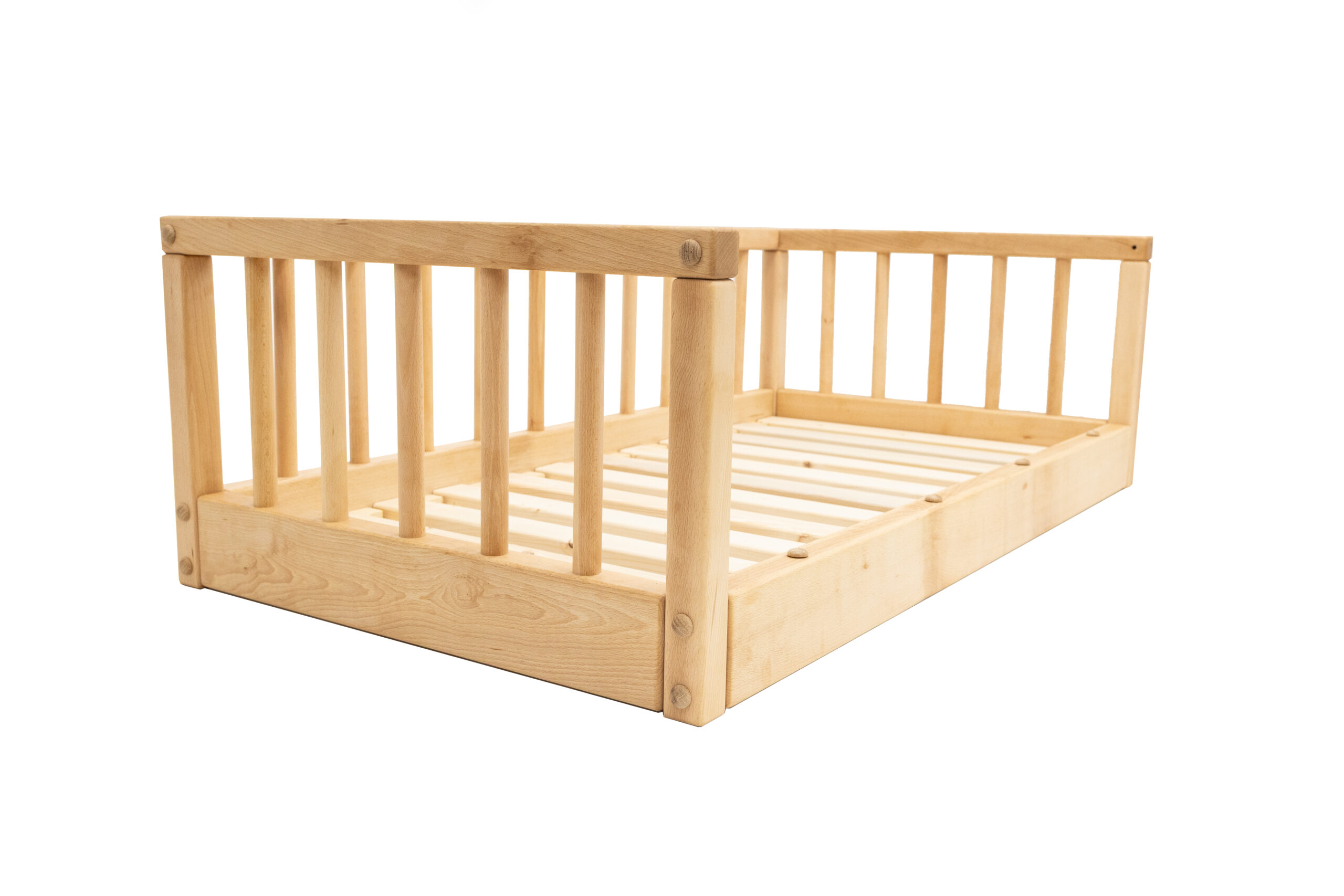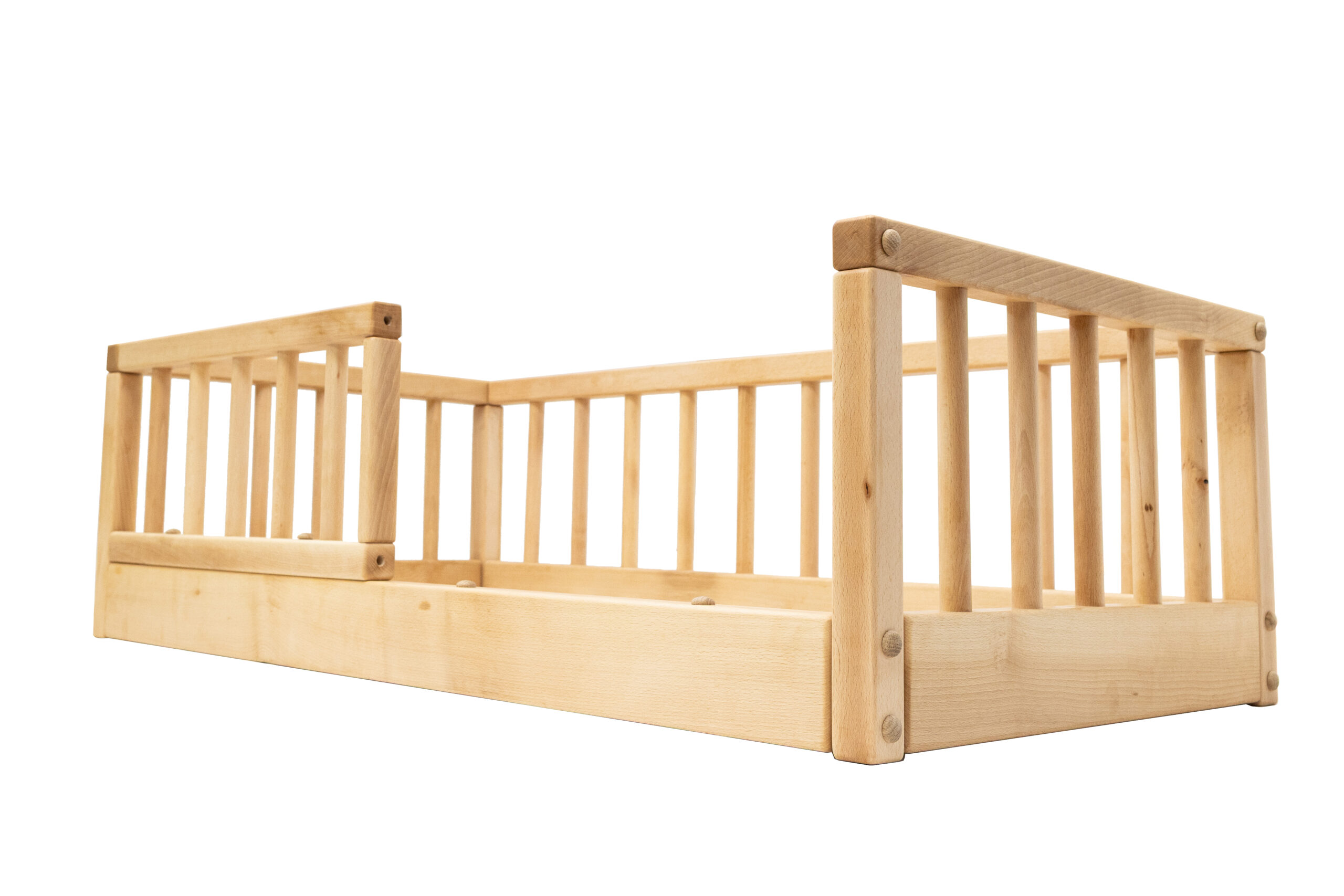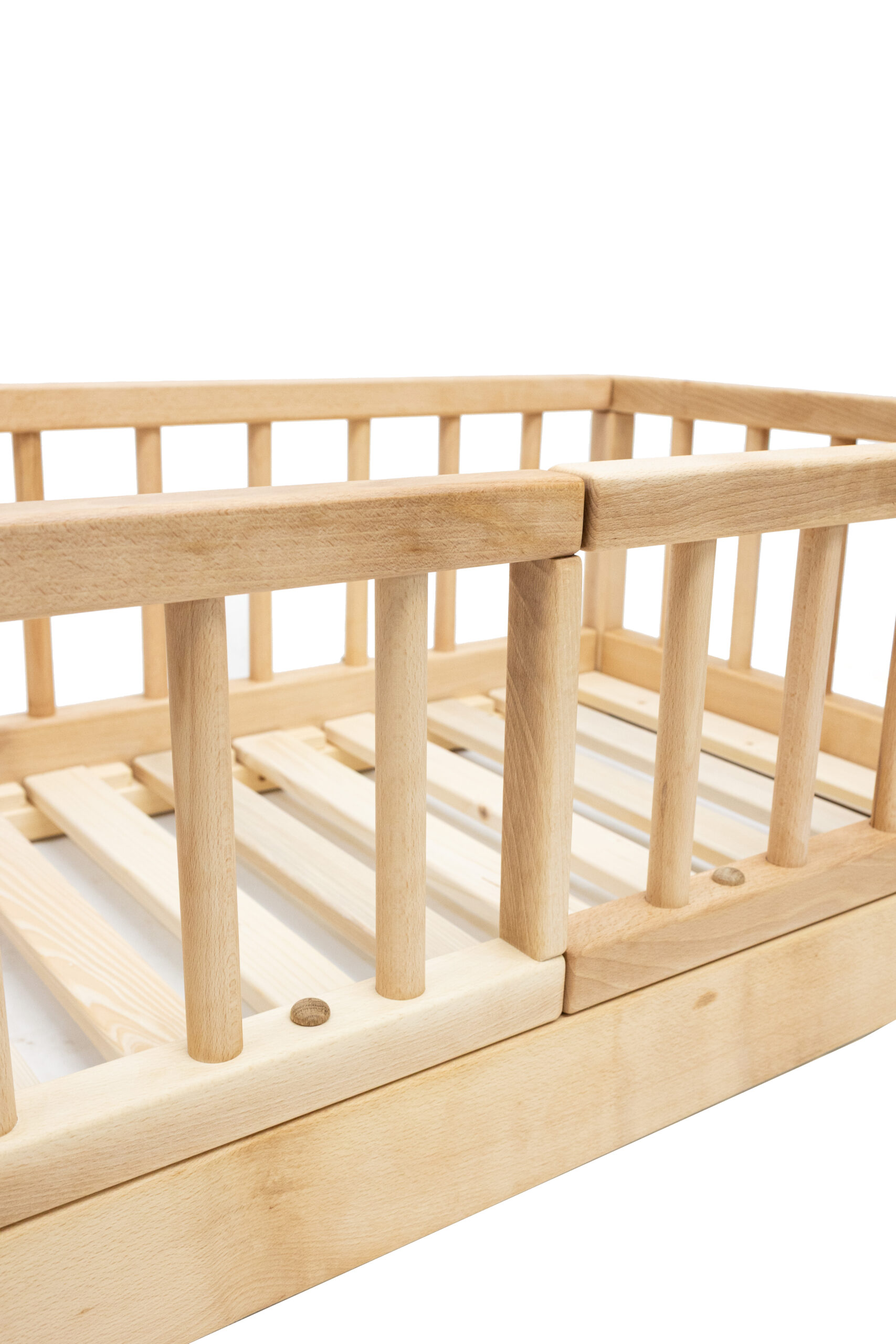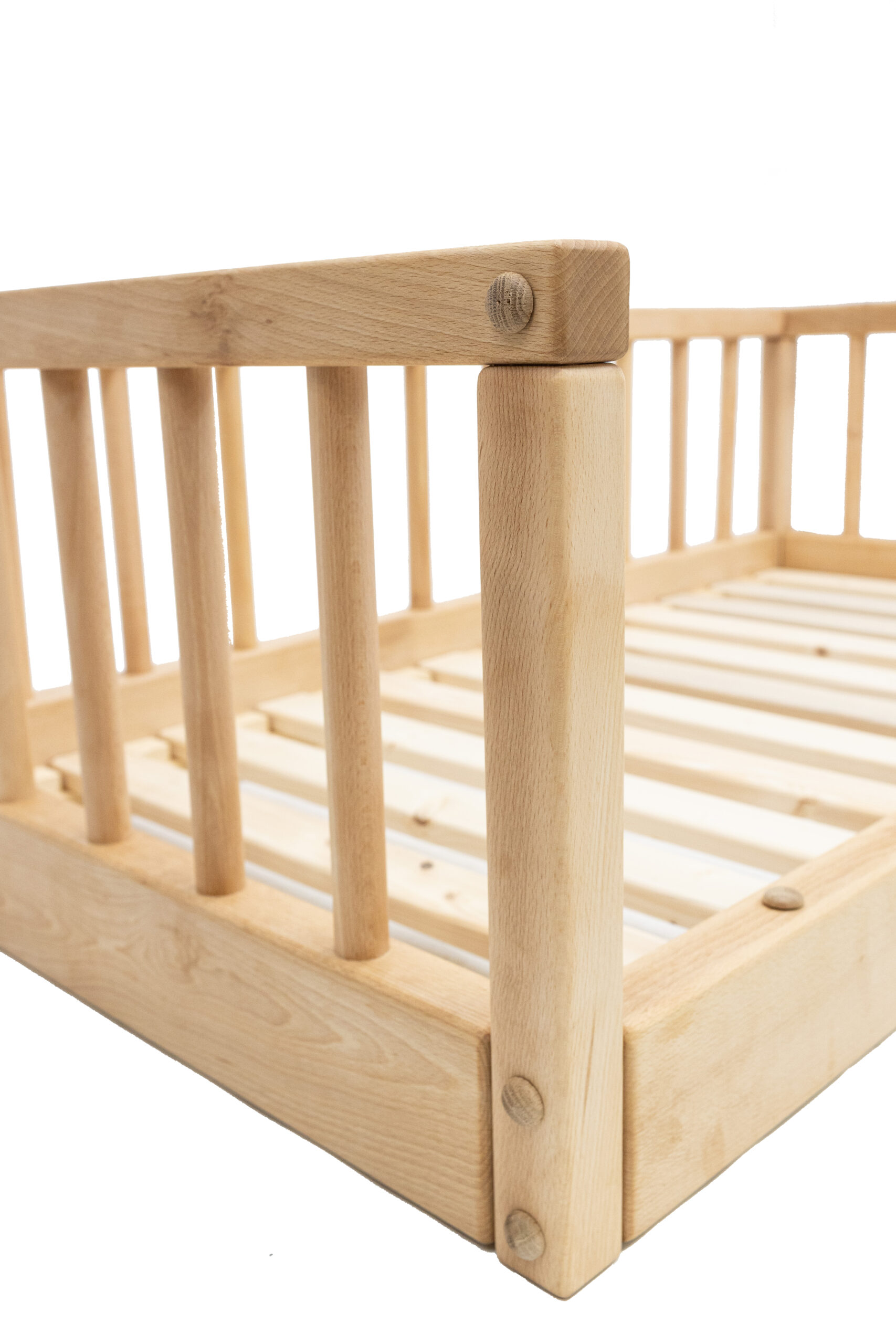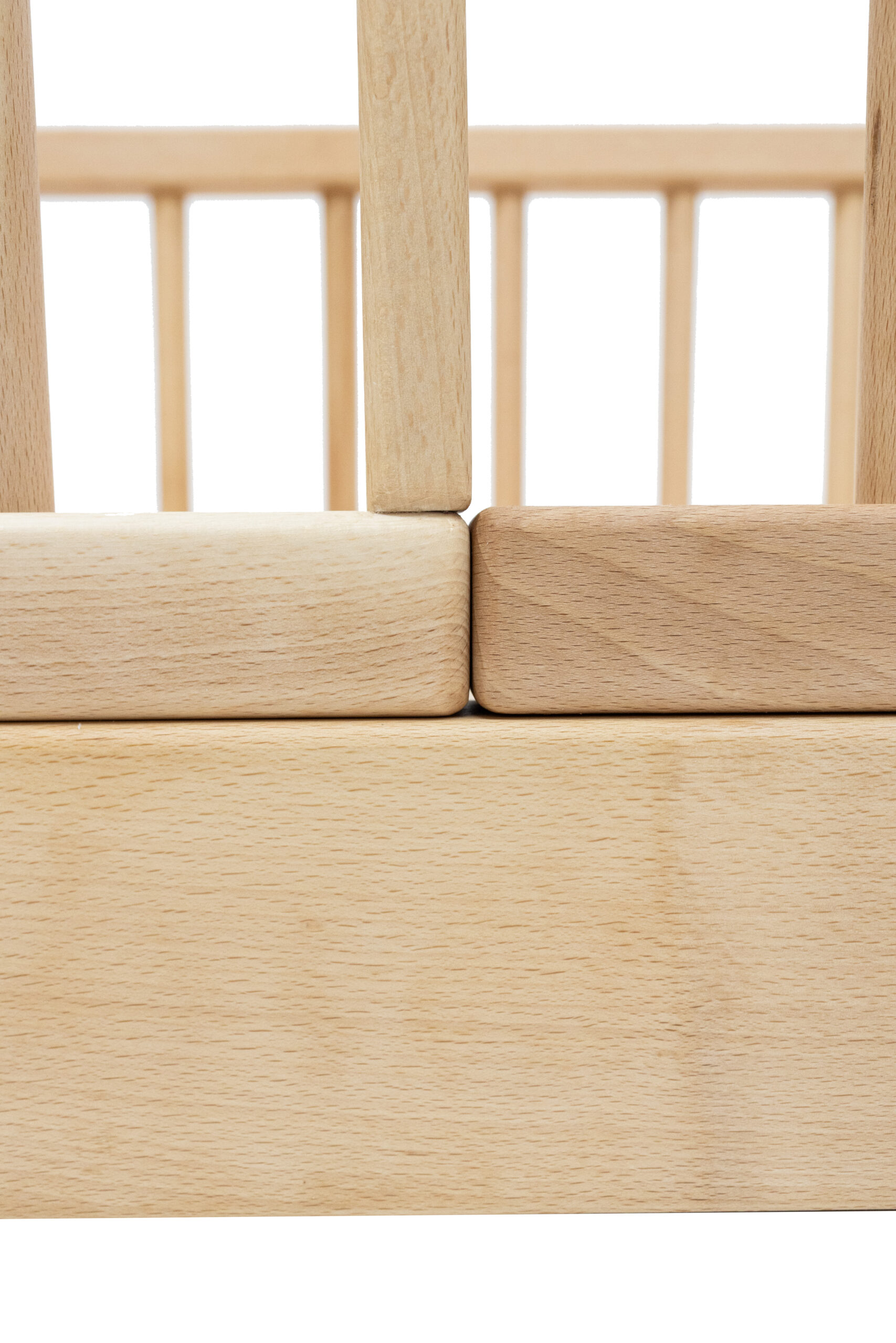 Otroška postelja 120 cm × 60 cm iz masivne bukve, premazana z naravnim oljem. Odstranljiva zaščitna ograja, varna zasnova in vgreznjeno ležišče. Idealna prva postelja za malčke. za najmlajše je izdelana iz masivnega bukovega lesa, ki slovi po svoji izjemni trdnosti, stabilnosti in varnosti. Postelja je premazana z naravnim oljem za les, ki ohranja naraven videz površine in poskrbi za prijeten občutek na dotik, hkrati pa nudi zaščito pri vsakodnevni uporabi.